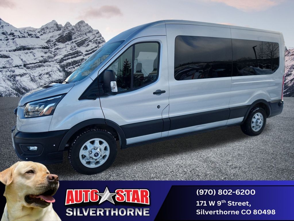 2023 Ford Transit-350 XLT Check out all these great option's Heavy-Duty Trailer Tow Package (Frame Mounted Hitch Receiver and Tow/Haul Mode w/Trailer Wiring Prov), 15-Passenger Seats, 3.73 Limited-Slip Axle Ratio, 360-Degree Camera w/Split View, 3rd row seats: split-bench, 4-Wheel Disc Brakes, 4th-Row Bench Seat, 50/50 Hinged Rear Door w/253-Degree Opening, 8 Speakers, ABS brakes, Air Conditioning, AM/FM radio, Auto High-beam Headlights, Auto Start-Stop Delete, Brake assist, Chrome High-Intensity Discharge (HID) Headlamps, Cloth Front Bucket Seats, Delay-off headlights, Driver door bin, Driver vanity mirror, Driver's Seat Mounted Armrest, Dual AGM Batteries (70 Amp-hr Each), Dual front impact airbags, Dual front side impact airbags, Dual-Note Horn, Ebony Cloth Bucket Seats, Electronic Air Temperature Control, Electronic Stability Control, Front anti-roll bar, Front Bucket Seats, Front Fog Lamps, Front License Plate Bracket, Front Overhead Shelf, Front reading lights, Front Sensing System, Front wheel independent suspension, Fully automatic headlights, Honeycomb Mesh Grille w/Chrome Surround, Illuminated entry, Intelligent Speed Assist (ISA), Large Center Console, Low tire pressure warning, Occupant sensing airbag, Overhead airbag, Panic alarm, Passenger door bin, Passenger seat mounted armrest, Passenger vanity mirror, Power door mirrors, Power steering, Power windows, Privacy Glass, Radio: AM/FM Stereo w/SYNC 4 & Nav, Radio: AM/FM Stereo w/SYNC 4/SiriusXM w/360L, Rain sensing wipers, Rear air conditioning, Rear window defroster, Remote keyless entry, Reverse Brake Assist, Reverse Sensing System, Running Boards, Side Sensing System, Steering wheel mounted audio controls, Tachometer, Telescoping steering wheel, Tilt steering wheel, Traction control, Traffic Sign Recognition (TSR), Variably intermittent wipers, Vehicle Maintenance Monitor, Wheels: 16" Silver Steel w/Exposed Lug Nuts, and Wheels: 16" Sparkle Silver Alloy.