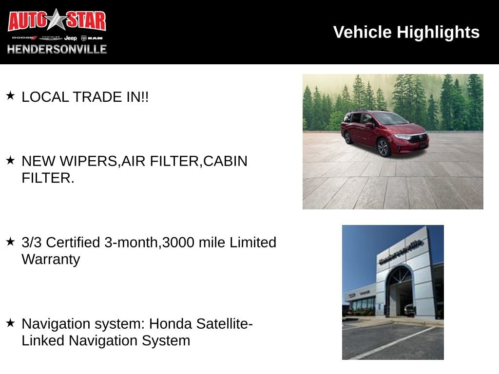 2022 Honda Odyssey Touring Check out all these great option's Navigation system: Honda Satellite-Linked Navigation System, 3.61 Axle Ratio, 3rd row seats: split-bench, 4-Wheel Disc Brakes, 7 Speakers, A/V remote: CabinControl, ABS brakes, Adaptive Cruise Control: Adaptive Cruise Control (ACC) with Low-Speed Follow, Air Conditioning, Alloy wheels, AM/FM radio: SiriusXM, Anti-whiplash front head restraints, Apple CarPlay/Android Auto, Auto High-beam Headlights, Auto-dimming Rear-View mirror, Automatic temperature control, Blind Spot Information (BSI) System warning, Brake assist, Bumpers: body-color, CD player, Compass, Delay-off headlights, Driver door bin, Driver vanity mirror, Driver's Seat Mounted Armrest, Dual front impact airbags, Dual front side impact airbags, DVD-Audio, Electronic Stability Control, Emergency communication system: HondaLink, Exterior Parking Camera Rear, Forward collision: Collision Mitigation Braking System (CMBS) + FCW mitigation, Four wheel independent suspension, Front anti-roll bar, Front Bucket Seats, Front dual zone A/C, Front fog lights, Front reading lights, Fully automatic headlights, Garage door transmitter: HomeLink, Headphones, Heated door mirrors, Heated Front Bucket Seats, Heated front seats, Illuminated entry, Knee airbag, Lane departure: Lane Keeping Assist System (LKAS) active, Leather Seat Trim, Leather steering wheel, Low tire pressure warning, Memory seat, Occupant sensing airbag, Outside temperature display, Overhead airbag, Overhead console, Panic alarm, Passenger door bin, Passenger seat mounted armrest, Passenger vanity mirror, Power door mirrors, Power driver seat, Power Liftgate, Power moonroof, Power passenger seat, Power steering, Power windows, Radio data system, Radio: 160-Watt AM/FM/HD/SiriusXM Audio System, Rear air conditioning, Rear anti-roll bar, Rear audio controls, Rear reading lights, Rear seat center armrest, Rear window defroster, Rear window wiper, Reclining 3rd row seat, Remote keyless entry, Security system, Speed control, Speed-sensing steering, Speed-Sensitive Wipers, Split folding rear seat, Spoiler, Steering wheel mounted audio controls, Tachometer, Telescoping steering wheel, Tilt steering wheel, Traction control, Trip computer, Turn signal indicator mirrors, Variably intermittent wipers, and Wheels: 19" Machine-Finished Alloy.