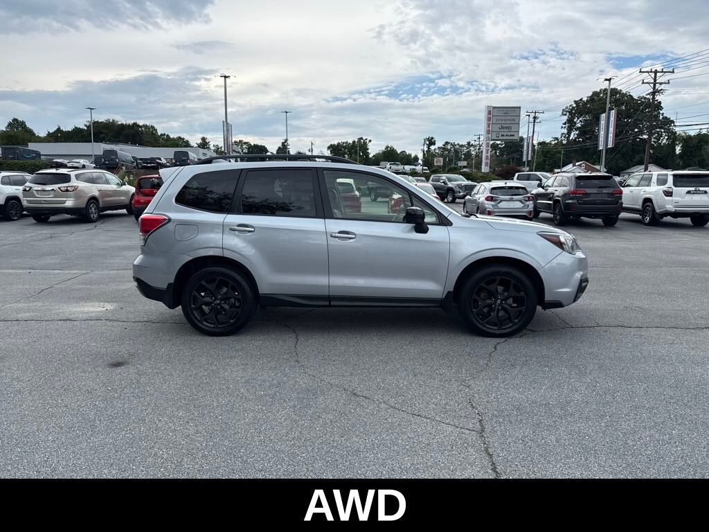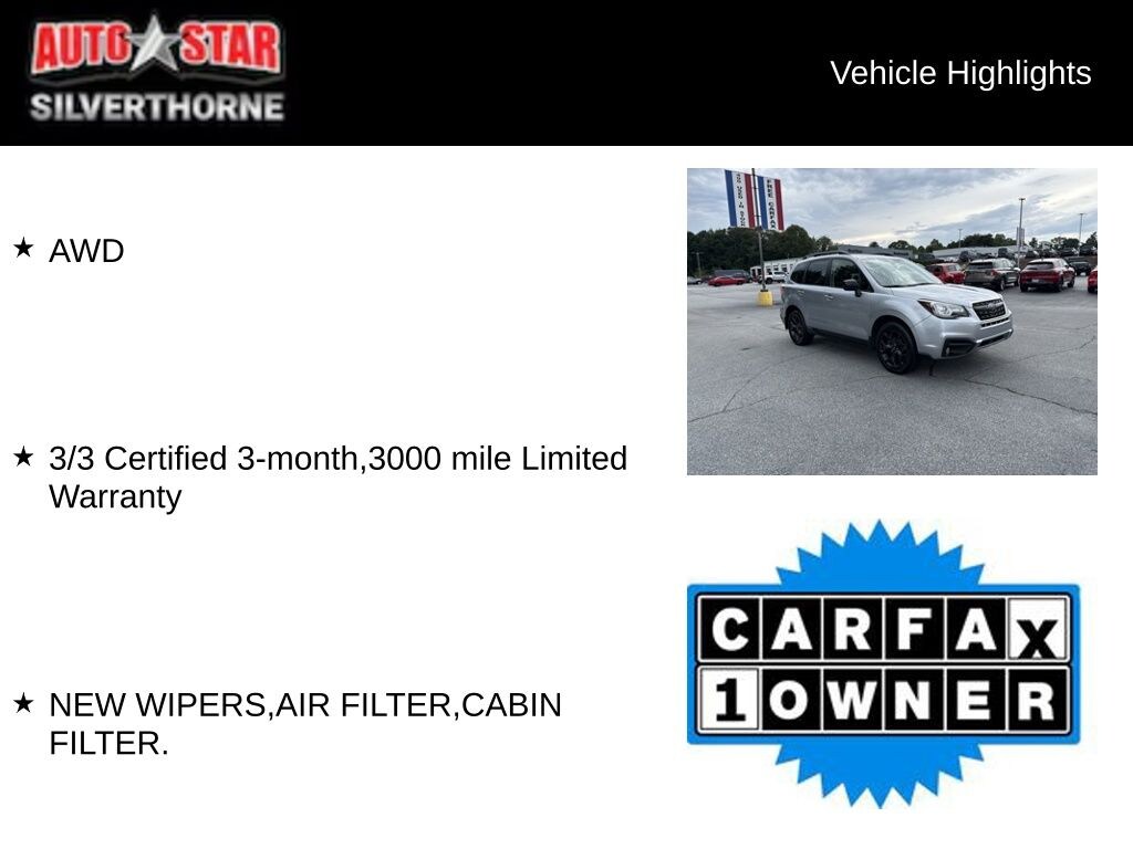 2018 Subaru Forester 2.5i Premium Check out all these great option's 4-Wheel Disc Brakes, 6 Speakers, ABS brakes, Air Conditioning, Alloy wheels, AM/FM radio: SiriusXM, Automatic temperature control, Brake assist, Bumpers: body-color, CD player, Driver door bin, Driver vanity mirror, Dual front impact airbags, Dual front side impact airbags, Electronic Stability Control, Emergency communication system: STARLINK, Exterior Parking Camera Rear, Four wheel independent suspension, Front anti-roll bar, Front Bucket Seats, Front Center Armrest, Front reading lights, Illuminated entry, Knee airbag, Low tire pressure warning, Occupant sensing airbag, Outside temperature display, Overhead airbag, Overhead console, Panic alarm, Passenger door bin, Passenger vanity mirror, Power door mirrors, Power driver seat, Power moonroof, Power steering, Power windows, Radio data system, Radio: Subaru Starlink 7.0" Multimedia Plus System, Rear anti-roll bar, Rear seat center armrest, Rear window defroster, Rear window wiper, Remote keyless entry, Roof rack: rails only, Security system, Speed control, Split folding rear seat, Spoiler, Steering wheel mounted audio controls, Tachometer, Telescoping steering wheel, Tilt steering wheel, Traction control, Trip computer, and Variably intermittent wipers.