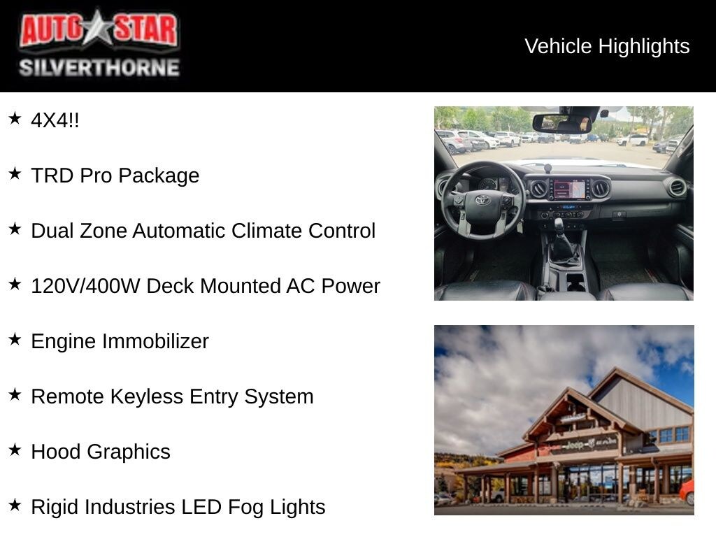 4X4!!, 120V/400W Deck Mounted AC Power, Auto-Dimming Rearview Mirror w/HomeLink, Black Overfenders, Blind Spot Monitor w/Rear Cross Traffic Alert, Dual Zone Automatic Climate Control, Engine Immobilizer, Hood Graphics, Lane Change Assist, Mesh Front Grille, Power Sliding Rear Window w/Privacy Glass, Projector-Beam Headlights, Rear Parking Assist Sonar, Remote Keyless Entry System, Rigid Industries LED Fog Lights, TRD Floor Mats, TRD Pro Cat-Back Exhaust, TRD Pro Exterior Badging, TRD Pro Package, TRD Pro Shift Knob, TRD-Tuned Off-Road Suspension (TR).